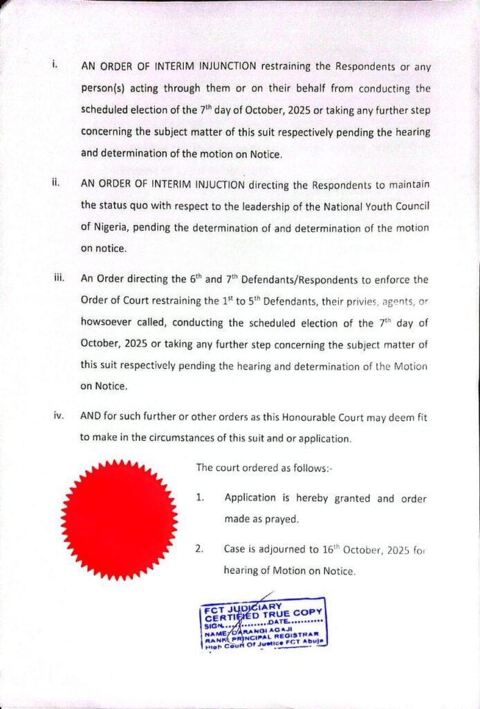 An FCT High Court in Abuja has issued an interim injunction restraining certain individuals from holding or proceeding with a purported parallel National Elective Congress of the National Youth Council of Nigeria, NYCN scheduled for today, pending the hearing and determination of a motion on notice in a suit before the Court.